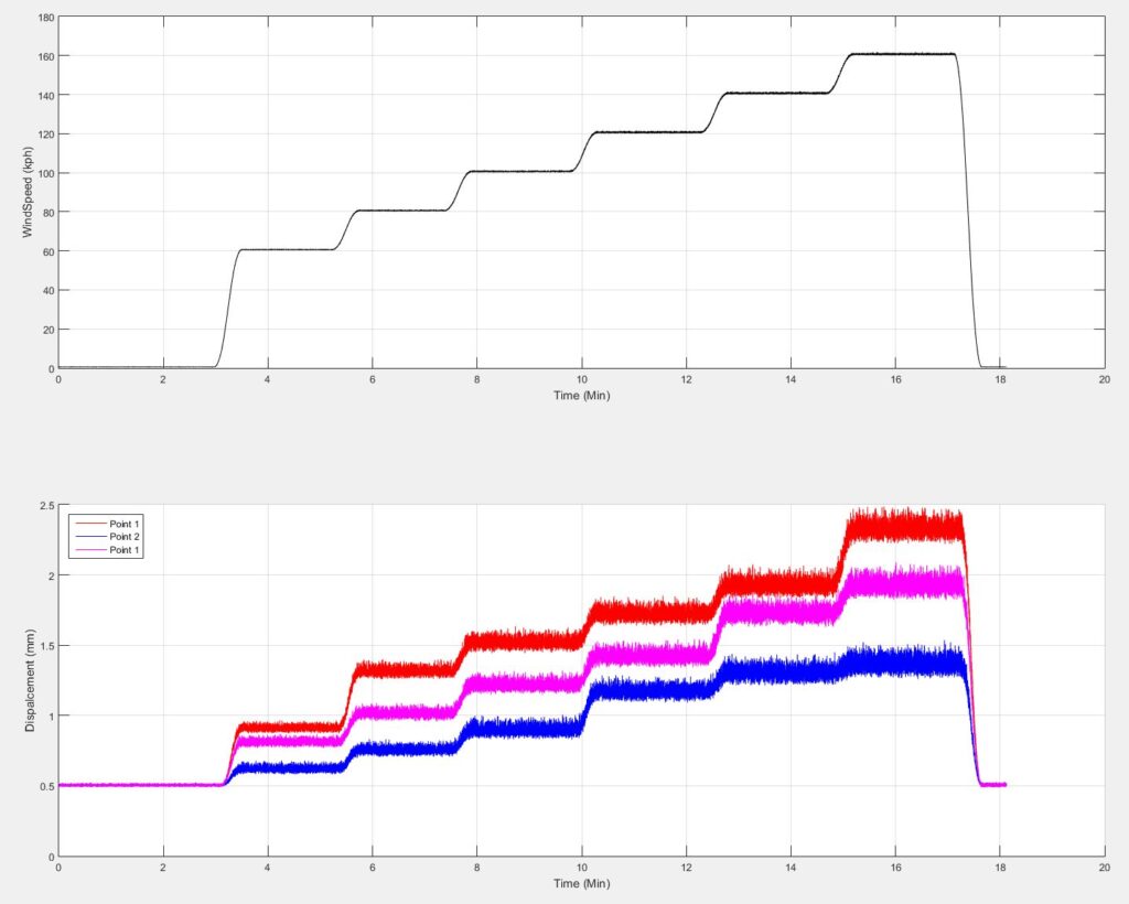 EZMotion can be adapted to work at long distance to stay out and not to disturb the flow of the wind around the object. The adhesive targets have no impact on the flow and can be attached to the structure at any -visible- place. Additional sensors that are synchronized with the 3D measurements, will provide windspeed or angle of attack. The relive movement is crucial to distinguish between movement of the body, or relative movement of a member. One or more points can be installed to study specific deformation modes.