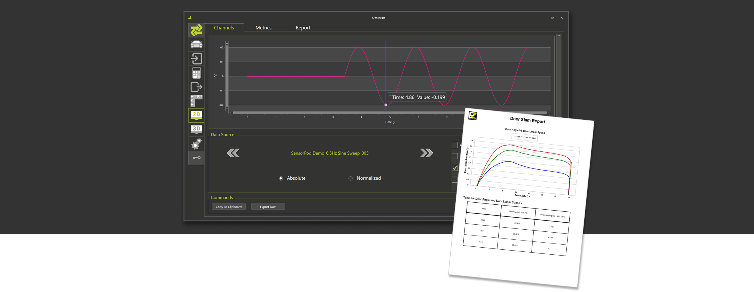 SensorPod is connected to IOManager for data recording and analysis. The multi-channel, multi-dimensional acquisition capabilities allow the user to chart complex systems for an efficient performance evaluation of a system.