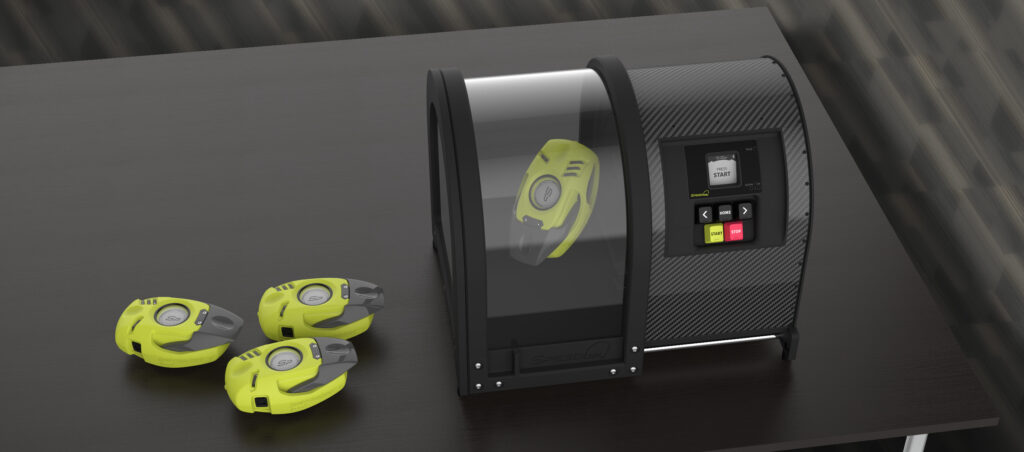 SpeedBay is an easy-to-operate verification tool used to validate inertial sensors on SpeedPod and EnergyPod devices. The system automatically runs a pre-defined procedure spinning the Pod device at various speeds. The data collected by the device is compared to the known procedure and the system produces a deviation report with pass fail results.