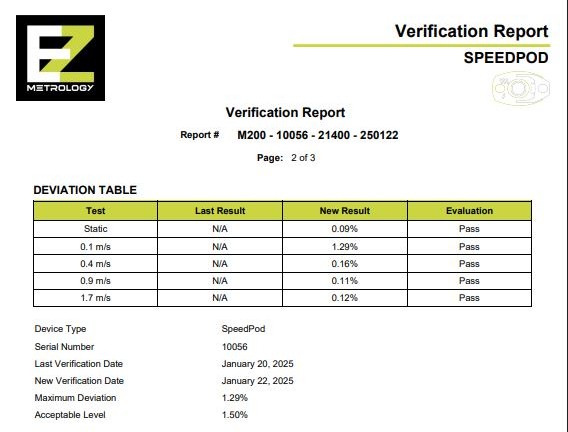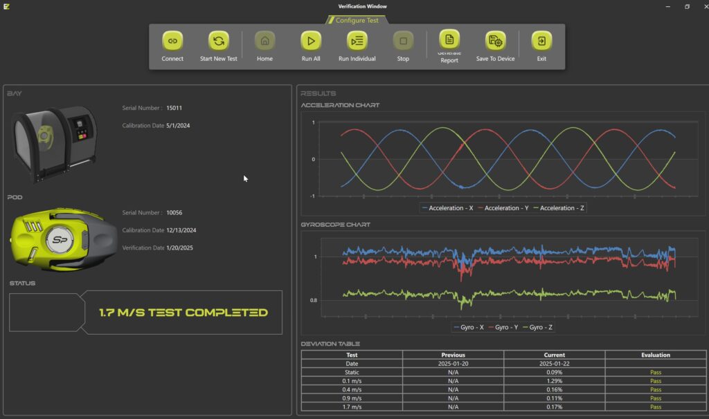 SpeedBay can automatically run a full verification procedure when connected with MyPod configuration software. Within minutes, SpeedBay will report a pass or fail verification status along with percent deviations for varying test speeds. The latest verification date is saved to the device. For specific verification at certain speeds, operators can use MyPod or the SpeedBay button controls to select and run desired procedures. With a Calibration Subscription, users can perform on-site calibrations of SpeedPod or EnergyPod inertial sensors. After the calibration procedure is complete, updated calibration factors will save to the Pod automatically.